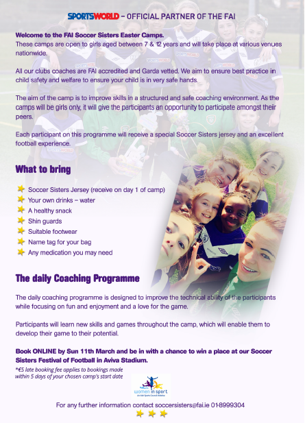 Log on to https://payments.fai.ie/fai-soccer-sisters/soccer-sisters-easter-camps-23-03-2016-dublin-2063.html