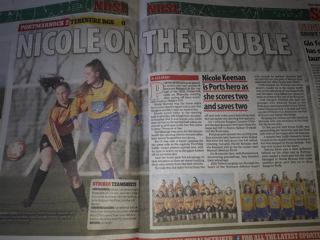 Notable mention in the article to Nicole Keenan for her "double agent role" with an impressive performance scoring twice in the opening half and moving into goal for the second.